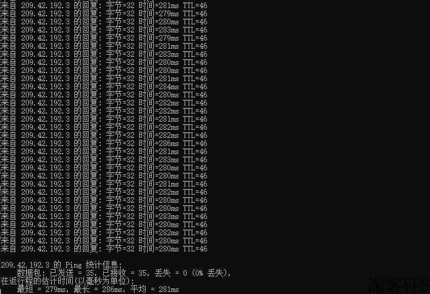 从Ping的效果来看,延迟在280ms左右,非常稳定,基本没有丢包的情况。