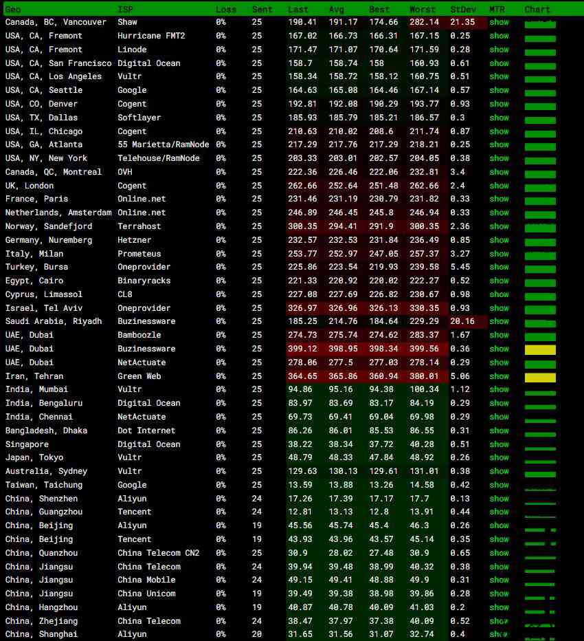 可以看到全球各地网络稳定性都还是不错的,不管是国内还是国外基本都没有丢包的情况。