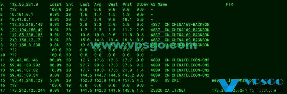 traceroute to 119.6.6.6 (119.6.6.6), 30 hops max, 32 byte packets 1 172.22.61.200 22.20 ms * 局域网 2 xe-3/2/0.re.lax.DMIT.com (193.41.248.189) 6.06 ms sign failed 3 AS4809.re.lax.DMIT.com (193.41.248.130) 0.89 ms AS906 美国, 加利福尼亚州, 洛杉矶, dmit.io 4 59.43.182.106 166.83 ms * 中国, 广东, 广州, chinatelecom.com.cn, 电信 5 * 6 59.43.130.125 154.00 ms * 中国, 广东, 广州, chinatelecom.com.cn, 电信 7 219.158.40.169 158.67 ms AS4837 中国, 广东, 广州, chinaunicom.com, 联通 8 219.158.121.85 154.47 ms AS4837 中国, 广东, 广州, chinaunicom.com, 联通 9 *10 119.6.197.202 188.44 ms AS4837 中国, 四川, 成都, chinaunicom.com, 联通11 119.6.195.34 197.86 ms AS4837 中国, 四川, 成都, chinaunicom.com, 联通12 119.6.6.6 186.31 ms AS4837 中国, 四川, 成都, chinaunicom.com, 联通