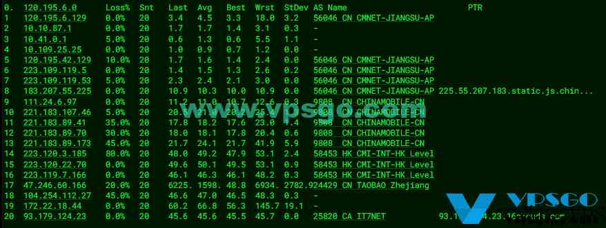 ----------------------------------------------------------------------广州电信traceroute to 14.215.116.1 (14.215.116.1), 30 hops max, 32 byte packets 1 172.22.18.200 13.50 ms * 局域网 2 * 3 104.254.112.26 43.07 ms * 中国, 香港, zenlayer.com 4 47.246.60.169 1.44 ms AS24429 中国, 香港, aliyun.com, 阿里云 5 203.12.205.133 1.14 ms AS4809 中国, 香港, chinatelecom.com.cn, 电信 6 59.43.247.21 1.26 ms * 中国, 香港, chinatelecom.com.cn, 电信 7 59.43.250.81 6.06 ms * 中国, 广东, 广州, chinatelecom.com.cn, 电信 8 59.43.187.109 7.97 ms * 中国, 广东, 广州, chinatelecom.com.cn, 电信 9 *10 *11 *12 113.108.209.198 10.41 ms AS4134 中国, 广东, 广州, chinatelecom.com.cn, 电信13 183.56.128.2 11.49 ms AS4134 中国, 广东, 广州, chinatelecom.com.cn, 电信14 14.215.116.1 17.41 ms AS4134 中国, 广东, 广州, chinatelecom.com.cn, 电信----------------------------------------------------------------------上海电信traceroute to 202.96.209.133 (202.96.209.133), 30 hops max, 32 byte packets 1 172.22.18.200 44.62 ms * 局域网 2 * 3 104.254.112.26 3.99 ms * 中国, 香港, zenlayer.com 4 47.246.60.169 1.48 ms AS24429 中国, 香港, aliyun.com, 阿里云 5 203.12.205.133 1.20 ms AS4809 中国, 香港, chinatelecom.com.cn, 电信 6 59.43.248.113 1.30 ms * 中国, 香港, chinatelecom.com.cn, 电信 7 59.43.183.81 28.71 ms * 中国, 上海, chinatelecom.com.cn, 电信 8 59.43.187.65 29.57 ms * 中国, 上海, chinatelecom.com.cn, 电信 9 59.43.138.45 37.39 ms * 中国, 上海, chinatelecom.com.cn, 电信10 61.152.24.186 34.00 ms AS4812 中国, 上海, chinatelecom.com.cn, 电信11 124.74.229.234 136.57 ms AS4812 中国, 上海, chinatelecom.com.cn, 电信12 ns-pd.online.sh.cn (202.96.209.133) 27.18 ms AS4812 中国, 上海, chinatelecom.com.cn, 电信----------------------------------------------------------------------厦门电信traceroute to 117.28.254.129 (117.28.254.129), 30 hops max, 32 byte packets 1 172.22.18.200 56.63 ms * 局域网 2 * 3 * 4 47.246.60.169 1.38 ms AS24429 中国, 香港, aliyun.com, 阿里云 5 203.12.205.133 1.14 ms AS4809 中国, 香港, chinatelecom.com.cn, 电信 6 59.43.248.17 10.11 ms * 中国, 香港, chinatelecom.com.cn, 电信 7 59.43.248.197 5.36 ms * 中国, 广东, 广州, chinatelecom.com.cn, 电信 8 * 9 *10 59.43.46.214 23.64 ms * 中国, 福建, chinatelecom.com.cn, 电信11 *12 *13 *14 *15 117.28.254.129 31.13 ms AS4809 中国, 福建, 厦门, chinatelecom.com.cn, 电信----------------------------------------------------------------------重庆联通traceroute to 113.207.25.138 (113.207.25.138), 30 hops max, 32 byte packets 1 172.22.18.200 14.56 ms * 局域网 2 * 3 * 4 47.246.61.53 2.70 ms AS24429 中国, 香港, aliyun.com, 阿里云 5 162.245.125.225 1.24 ms AS10099 中国, 香港, chinaunicom.com, 联通 6 61.14.201.93 5.36 ms * 中国, 香港, chinaunicom.com, 联通 7 43.252.86.129 3.53 ms AS10099 中国, 香港, chinaunicom.com, 联通 8 219.158.20.97 9.03 ms AS4837 中国, 香港, chinaunicom.com, 联通 9 219.158.4.1 13.15 ms AS4837 中国, 广东, 广州, chinaunicom.com, 联通10 219.158.3.81 13.12 ms AS4837 中国, 广东, 广州, chinaunicom.com, 联通11 219.158.22.74 35.72 ms AS4837 中国, 重庆, chinaunicom.com, 联通12 113.207.25.138 39.92 ms AS4837 中国, 重庆, chinaunicom.com, 联通----------------------------------------------------------------------成都联通traceroute to 119.6.6.6 (119.6.6.6), 30 hops max, 32 byte packets 1 172.22.18.200 13.25 ms * 局域网 2 * 3 * 4 * 5 162.245.125.225 1.29 ms AS10099 中国, 香港, chinaunicom.com, 联通 6 162.245.124.9 2.71 ms AS10099 中国, 香港, chinaunicom.com, 联通 7 202.77.23.25 10.19 ms AS10099 中国, 香港, chinaunicom.com, 联通 8 219.158.10.53 10.78 ms AS4837 中国, 广东, 广州, chinaunicom.com, 联通 9 219.158.103.37 12.70 ms AS4837 中国, 广东, 广州, chinaunicom.com, 联通10 *11 *12 119.6.197.254 37.31 ms AS4837 中国, 四川, 成都, chinaunicom.com, 联通13 119.6.195.38 37.87 ms AS4837 中国, 四川, 成都, chinaunicom.com, 联通14 119.6.6.6 43.40 ms AS4837 中国, 四川, 成都, chinaunicom.com, 联通----------------------------------------------------------------------上海移动traceroute to 120.204.197.126 (120.204.197.126), 30 hops max, 32 byte packets 1 172.22.18.200 22.07 ms * 局域网 2 * 3 * 4 47.246.60.165 2.61 ms AS24429 中国, 香港, aliyun.com, 阿里云 5 223.119.7.165 1.55 ms AS58453 中国, 香港, chinamobile.com, 移动 6 223.120.2.253 2.24 ms AS58453 中国, 香港, chinamobile.com, 移动 7 223.120.3.190 30.94 ms AS58453 中国, 上海, chinamobile.com, 移动 8 221.183.89.182 28.30 ms AS9808 中国, 上海, chinamobile.com, 移动 9 221.183.89.69 29.11 ms AS9808 中国, 上海, chinamobile.com, 移动10 *11 *12 120.204.194.10 45.99 ms AS9808 中国, 上海, chinamobile.com, 移动13 120.204.197.126 40.90 ms AS9808 中国, 上海, chinamobile.com, 移动----------------------------------------------------------------------成都移动traceroute to 183.221.253.100 (183.221.253.100), 30 hops max, 32 byte packets 1 172.22.18.200 17.14 ms * 局域网 2 104.254.113.226 3.06 ms * 中国, 香港, zenlayer.com 3 * 4 47.246.60.165 1.42 ms AS24429 中国, 香港, aliyun.com, 阿里云 5 223.119.7.165 1.50 ms AS58453 中国, 香港, chinamobile.com, 移动 6 223.120.22.65 2.31 ms AS58453 中国, 香港, chinamobile.com, 移动 7 223.120.3.202 27.51 ms AS58453 中国, 上海, chinamobile.com, 移动 8 221.183.89.182 28.27 ms AS9808 中国, 上海, chinamobile.com, 移动 9 221.183.89.69 28.90 ms AS9808 中国, 上海, chinamobile.com, 移动10 221.183.89.46 29.00 ms AS9808 中国, 上海, chinamobile.com, 移动11 *12 221.183.46.174 54.79 ms AS9808 中国, 北京, chinamobile.com, 移动13 *14 183.221.253.100 59.76 ms AS9808 中国, 四川, 成都, chinamobile.com, 移动----------------------------------------------------------------------成都教育网traceroute to 202.112.14.151 (202.1