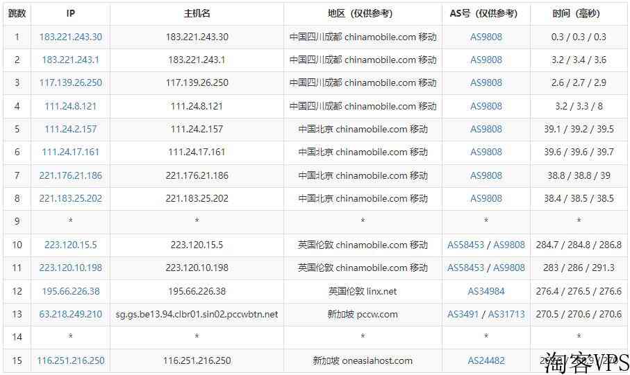 移动去程路由是从北京网口出去,绕道英国伦敦节点后到达新加坡机房。