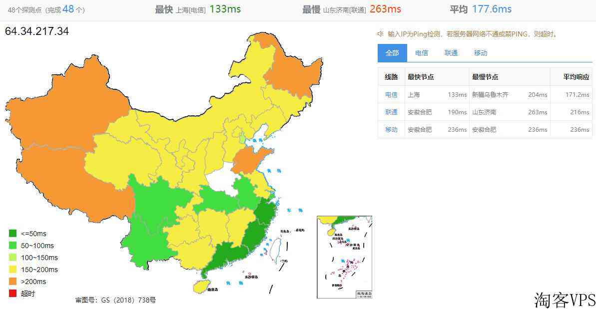 下面我们再看看全国三网Ping的延迟效果,如下所示: