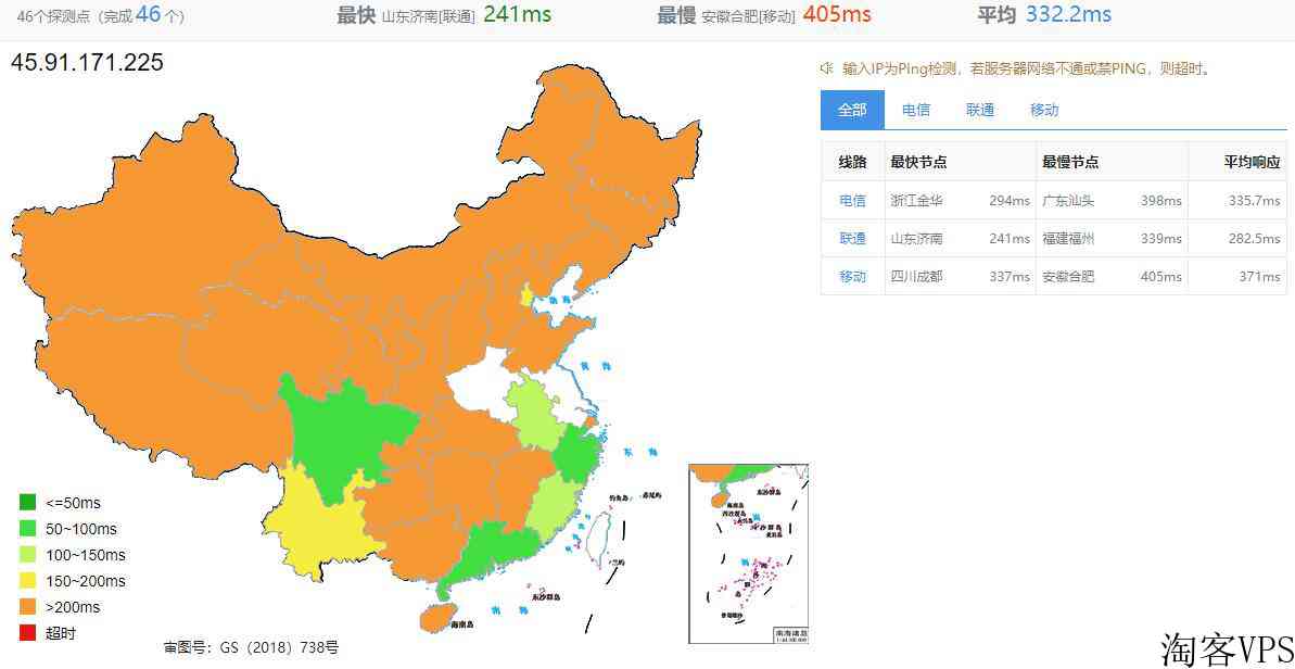 可以看到全国三网Ping的平均延迟在332ms左右,其中电信网络延迟335ms,联通网络延迟282ms,移动网络延迟371ms。