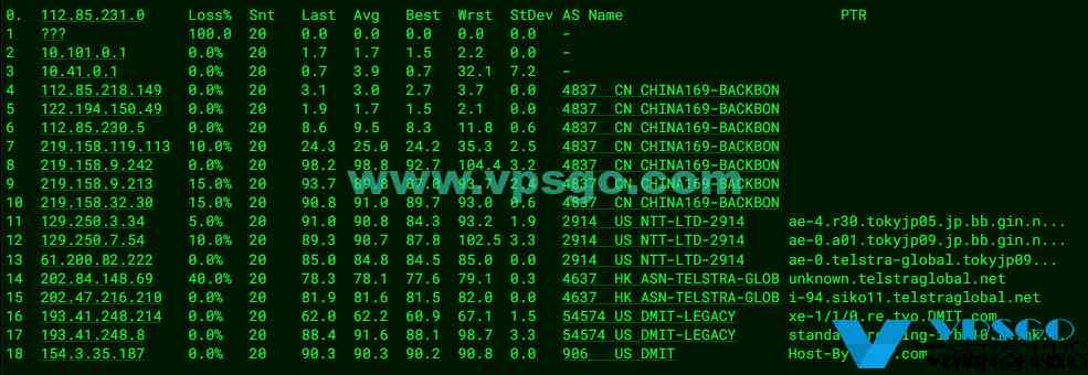traceroute to 113.207.25.138 (113.207.25.138), 30 hops max, 32 byte packets 1 standard-routing-irb-10.re.hkg.DMIT.com (193.41.248.8) 0.47 ms AS54574 China, Hong Kong, dmit.io 2 * 3 * 4 223.120.3.178 26.53 ms AS58453 China, Shanghai, ChinaMobile 5 221.183.89.174 28.42 ms AS9808 China, Shanghai, ChinaMobile 6 221.183.89.69 28.27 ms AS9808 China, Shanghai, ChinaMobile 7 * 8 * 9 *10 *11 219.158.106.201 101.76 ms AS4837 China, Chongqing, ChinaUnicom12 113.207.25.138 96.84 ms AS4837 China, Chongqing, ChinaUnicom