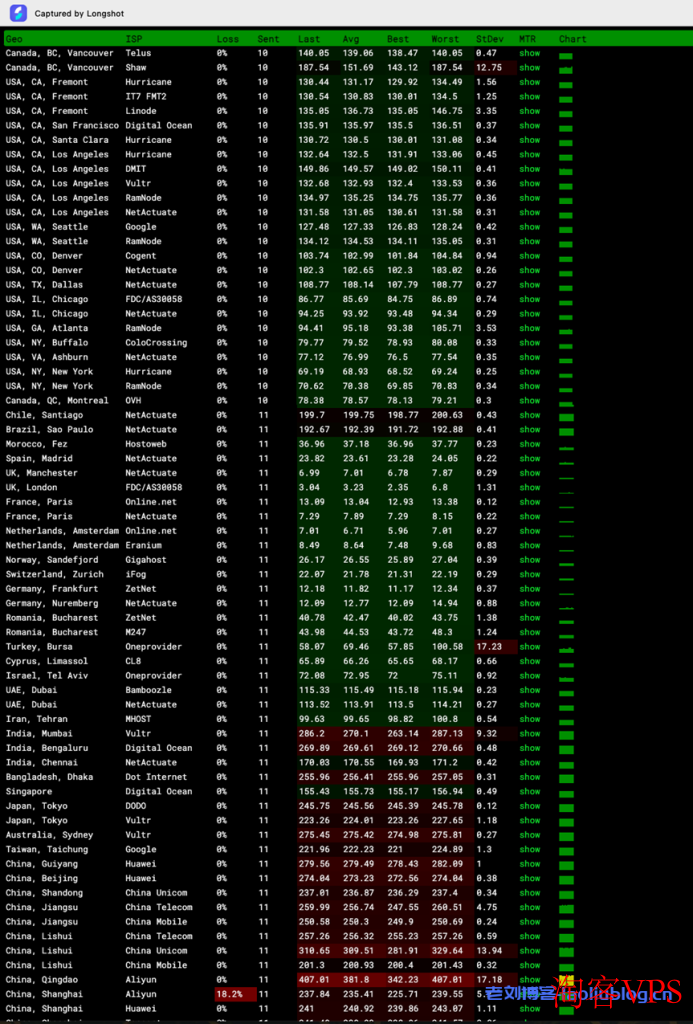 - 测试工具:MTR (My Traceroute),记录了从测试节点到全球多个地区的网络延迟数据。