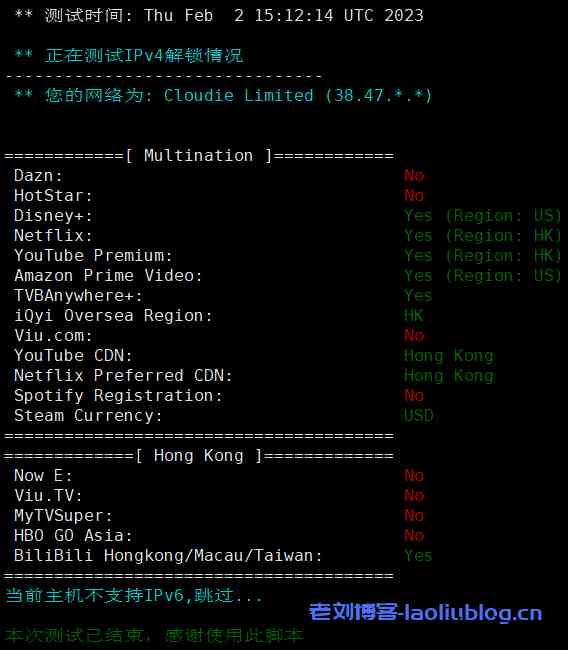 可以看出,拿到的机器是CPU为E5-2696v3@2.30GHz的,配置1核1G内存,10G硬盘,机器是Cloudie机房的;解锁港区奈菲、油管等流媒体;磁盘I/O读取速度在520MB/s左右。