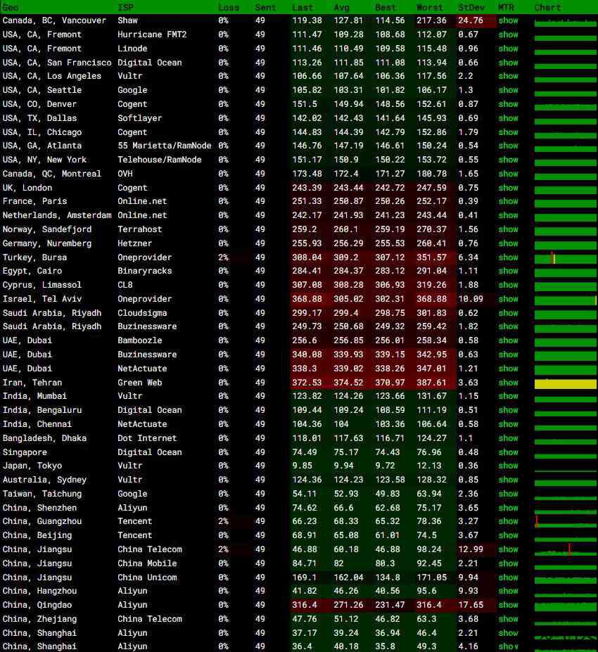 下面我们看看全球各地网络节点的网络稳定性情况,如下所示: