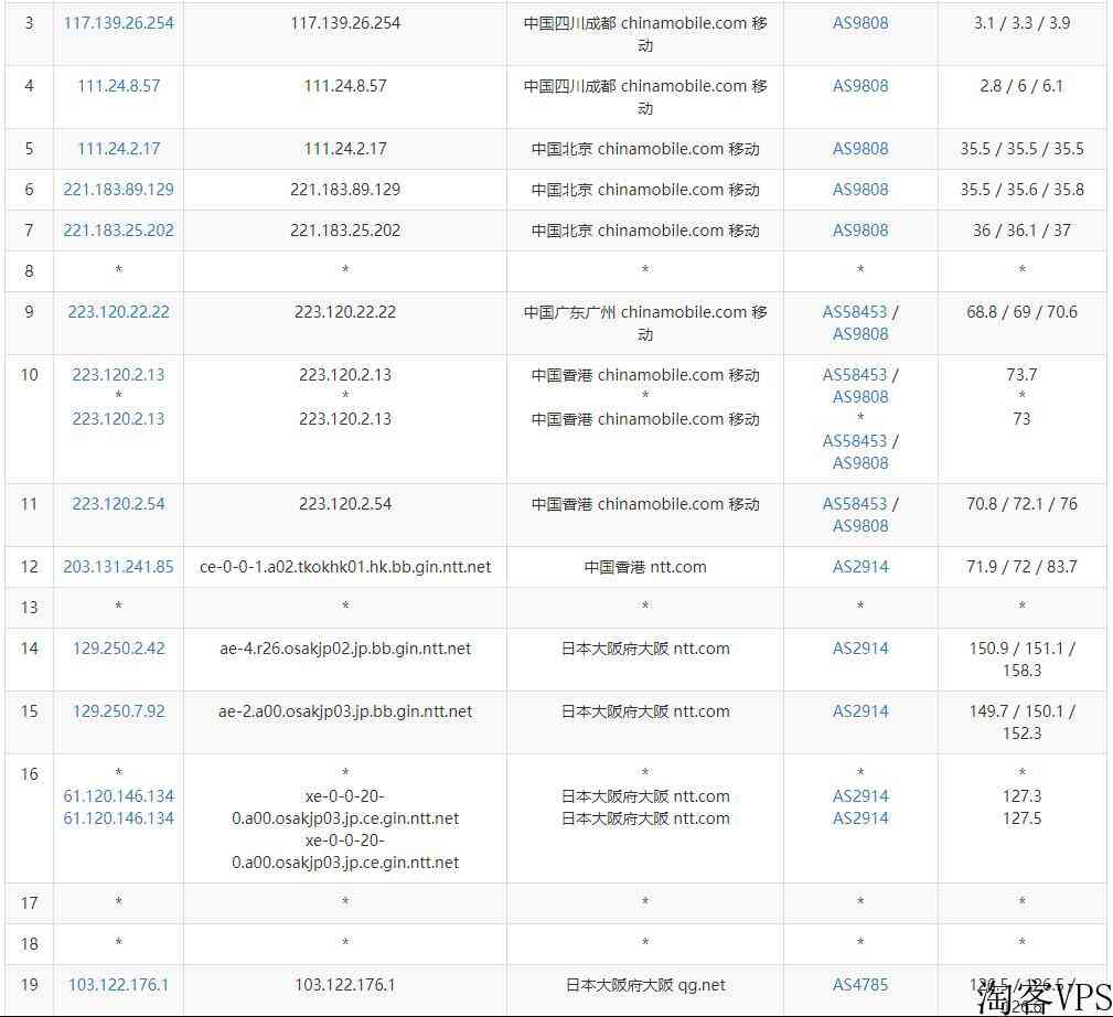 移动去程路由是从北京网口出去,经过香港节点后到达大阪机房。