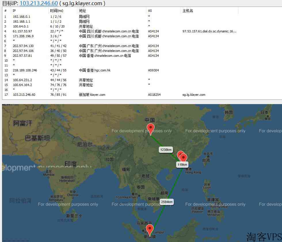 可以看到,KVMLA的新加坡VPS国内是直连的,路由通过香港后就直接到了新加坡,没有绕道的情况,所以路由还是相当可以的。